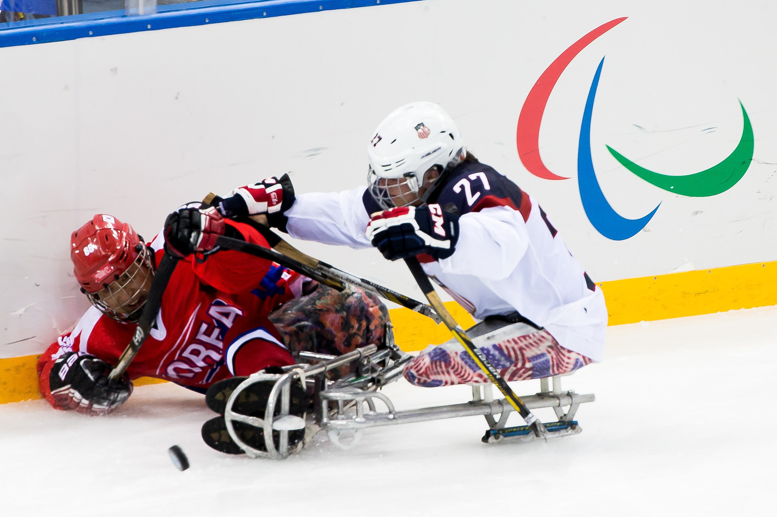 USA Sled Hockey player, Josh Pauls, checks Korea into the boards to gain the puck. USA wins 3-0