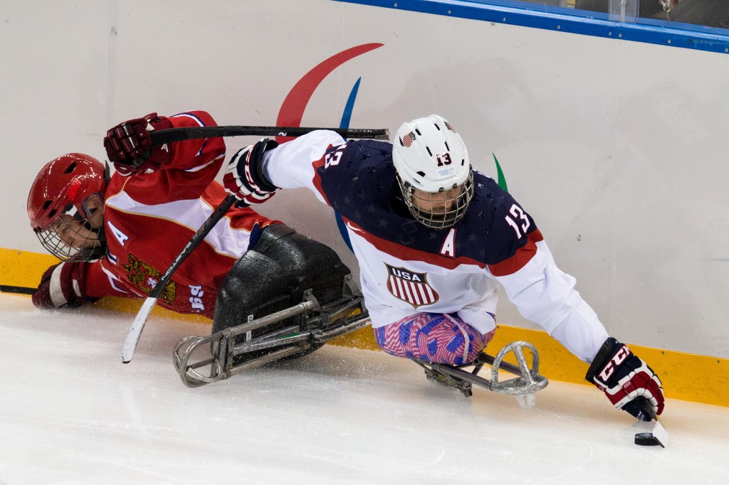 Wounded Warrior Project veteran, Joshua Sweeney, takes the puck from Russia in the gold medal game during the 2014 Winter Paralympics in Sochi.