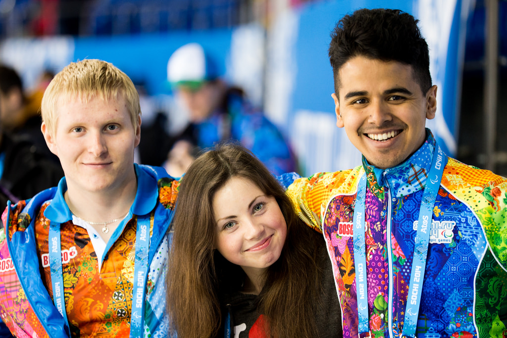 Sochi 2014 volunteers pose for a photo at the first USA vs Russia Sled Hockey game.