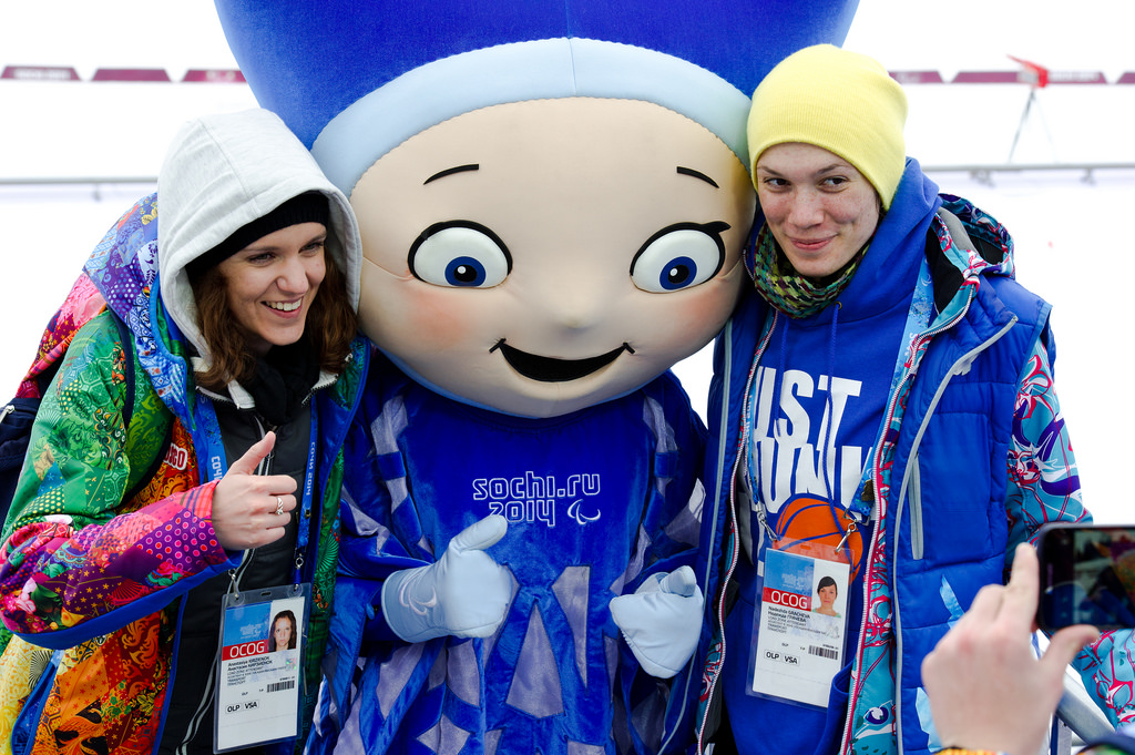 A Sochi 2014 mascot poses with volunteers at the Biathalon course.