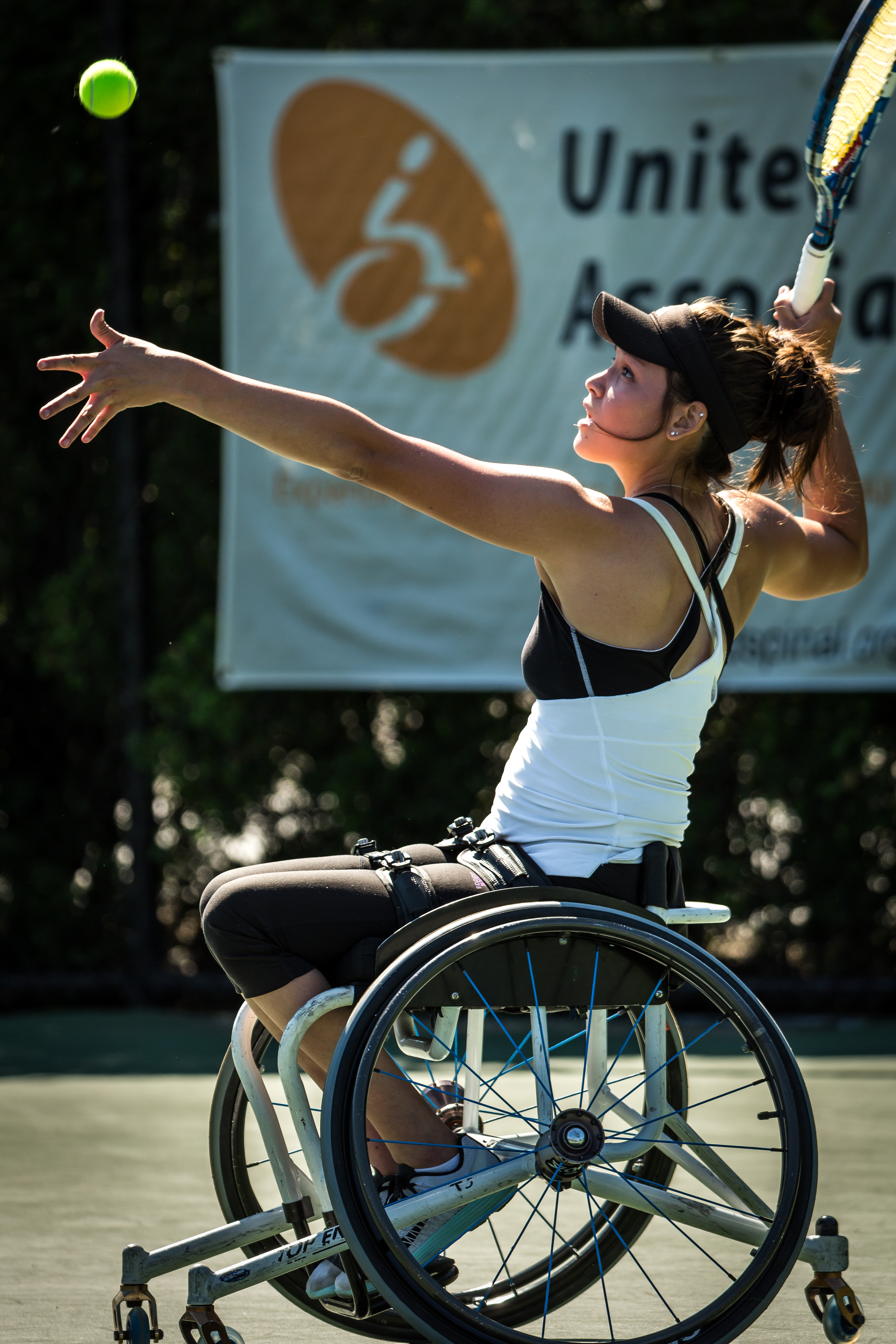 Dana Mathewson reaches to serve the ball at the 14th Annual Jana Hunsaker Memorial Wheelchair Tennis Tournament