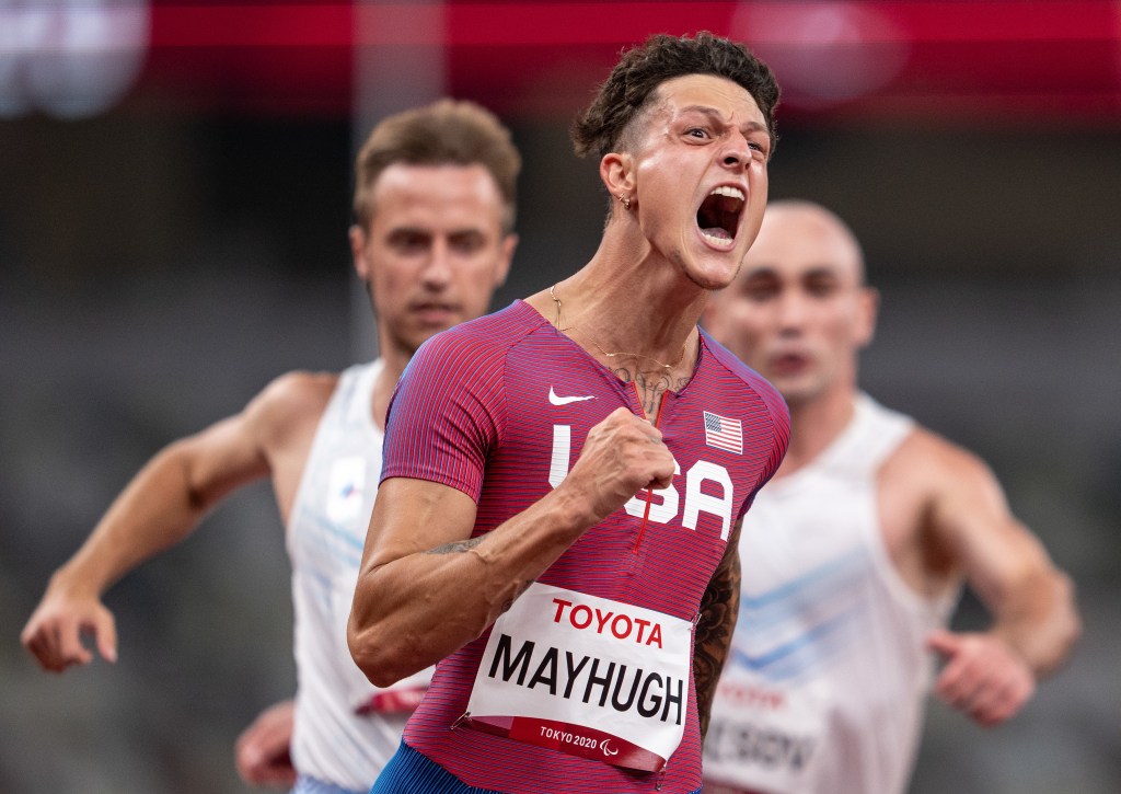 Nick Mayhugh will bring home gold from his very first Paralympic games, setting a world record and a Paralympic record to boot with a time of 10.95. He described feeling a “rush of joy” at his victory.
