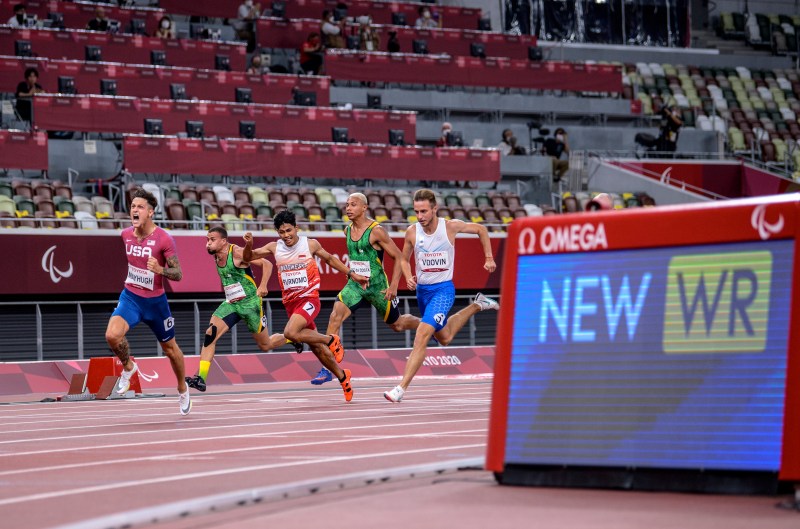 Nick Mayhugh USA winning the MenÕs 100m – T37 Final, Athletics, in a new World Record time, ahead of Andrei Vdovin RPC and Saptoyoga Purnomo INA at the Tokyo Olympic Stadium. Tokyo 2020 Paralympic Games, Tokyo, Japan, Friday 27 August 2021. Photo: OIS/Joel Marklund. Handout image supplied by OIS/IOC