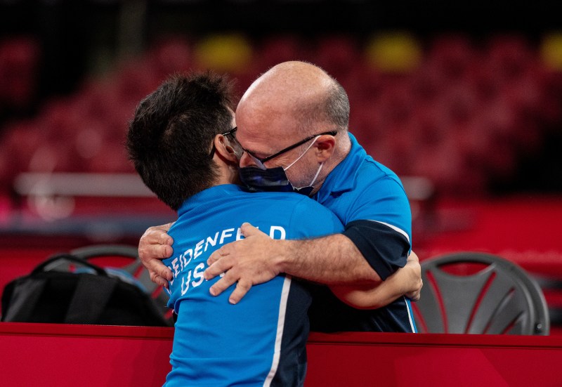Ian Seidenfeld USA gets a hug rom his coach and Father after defeating Peter Rosenmeier DEN in the Table Tennis Men’s Singles Class 6 Gold Medal match at the Tokyo Metropolitan Gymnasium. Tokyo 2020 Paralympic Games, Tokyo, Japan, Saturday 28 August 2021. Photo: OIS/Joe Toth. Handout image supplied by OIS/IOC