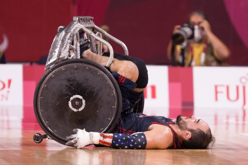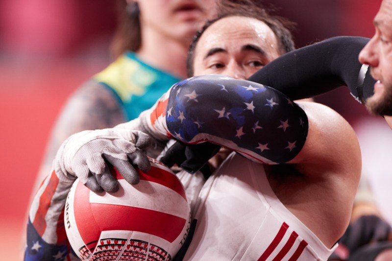 United States’ Chuck Aoki lies on the ground after taking a hit on August 29, 2021 during the Championship game of the Wheelchair Rugby Tournament at Tokyo 2020. (PHOTO CREDIT: Michael A. Clubine)