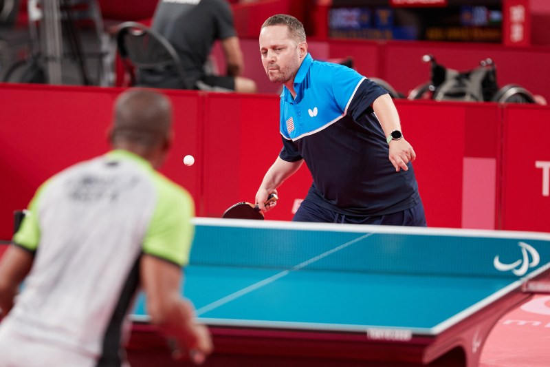 Tahl Leibovitz (Blue) attempts to return a Nigerian volley during a Table Tennis Matchup on August 31, 2021. (PHOTO CREDIT: Danny Chin)