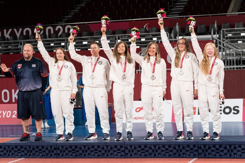 The U.S. women’s goalball team accepts the silver medal at the Tokyo 2020 Paralympics on Sept. 3, 2021. (PHOTO CREDIT: Lev Radin)