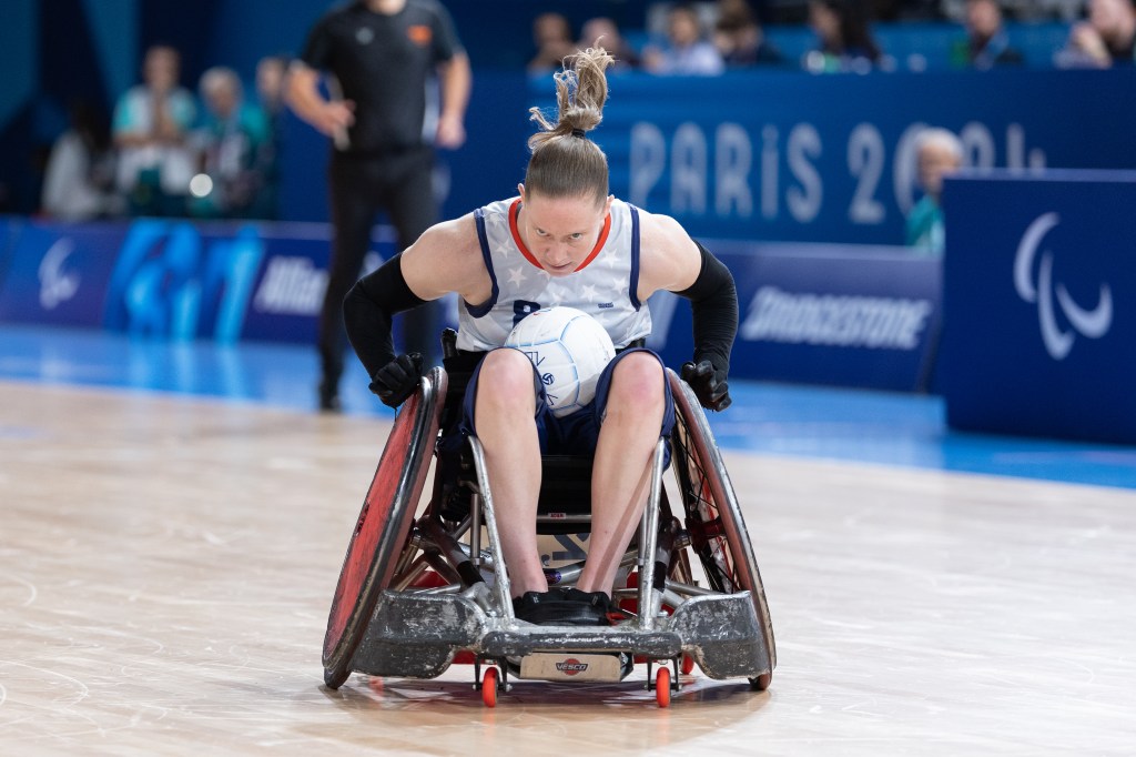 Sarah Adam made her Paralympic debut with six tries over 16:09 of playing time. A professor of occupational therapy at St. Louis University in Missouri, Adam first qualified for the national team in 2022, winning gold at the Parapan American Games in Santiago in November 2023. Now, she’s on the biggest stage for wheelchair rugby in the world.