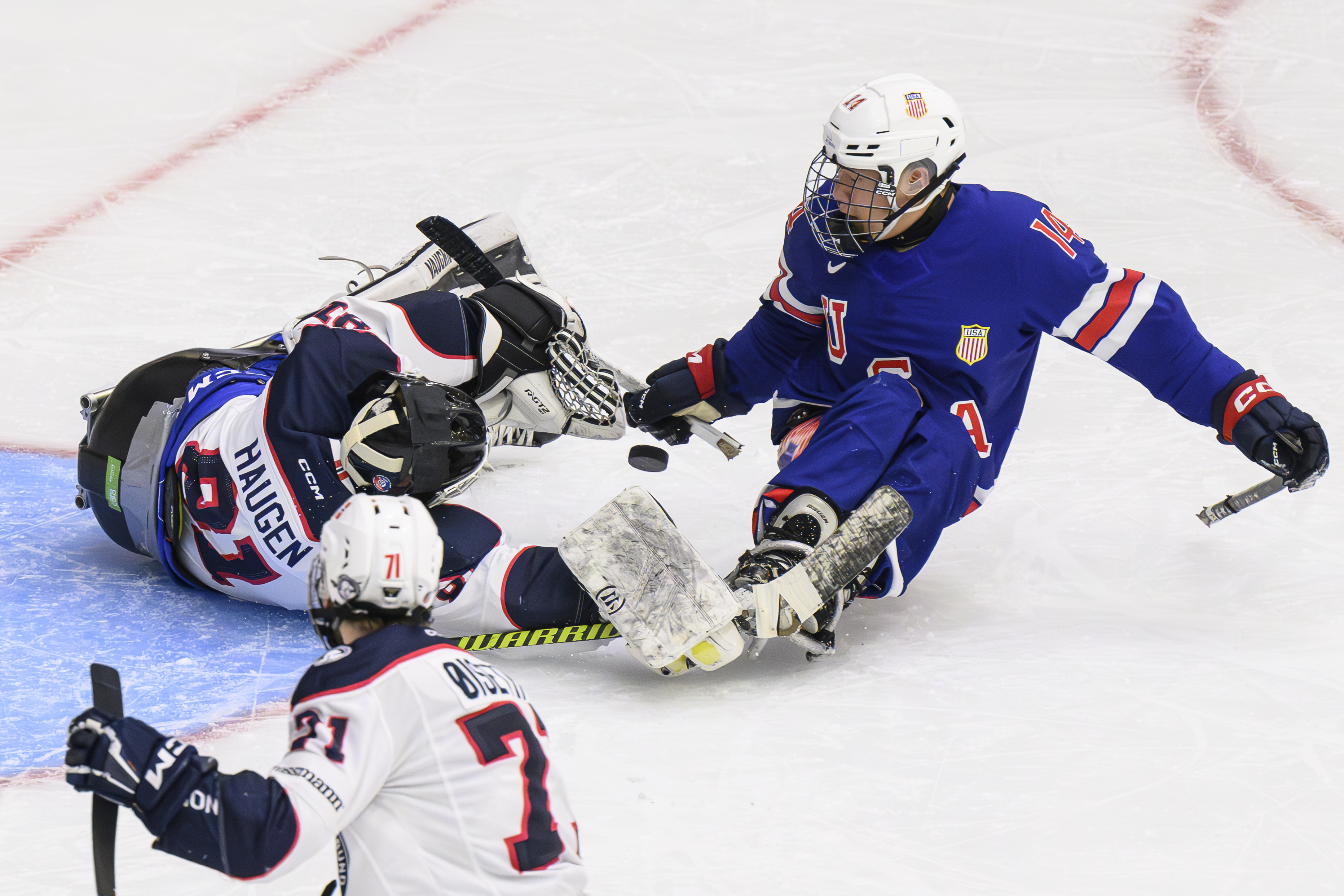 Evan Nichols ignited the American offense just under three minutes into the first period, finishing a setup from veteran defenseman Josh Pauls. Noah Grove and Declan Farmer followed quickly, and the U.S. went into the first intermission with a 3-0 lead, having outshot Norway 13-1.