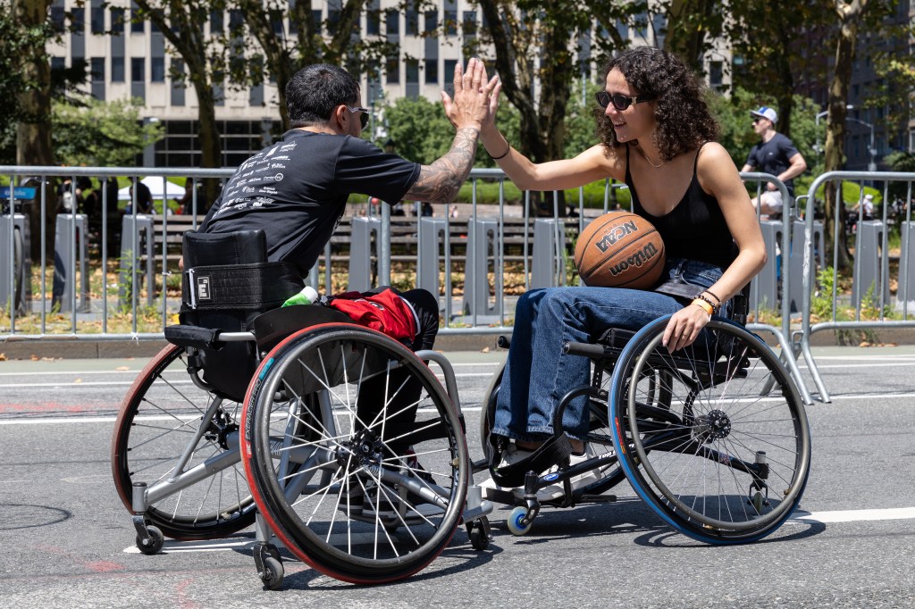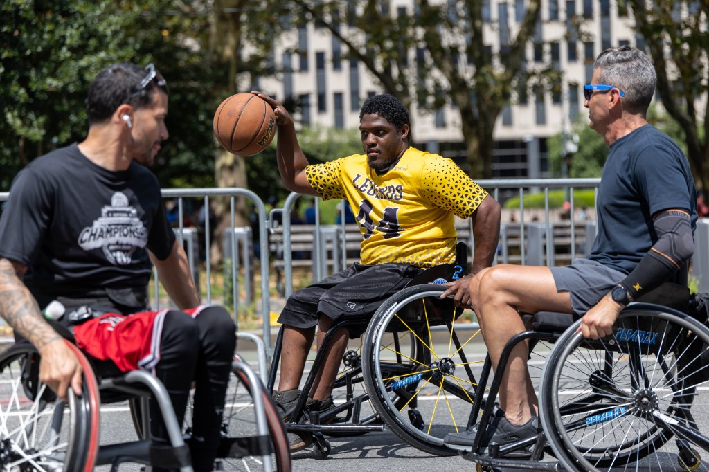 NEW YORK, NY — At the intersection of Centre Street and Lafayette Street, beneath the skyline of Lower Manhattan, the Wheelchair Sports Federation set up a basketball court at the Foley Square Rest Stop, inviting New Yorkers to experience the game from a different point of view.
