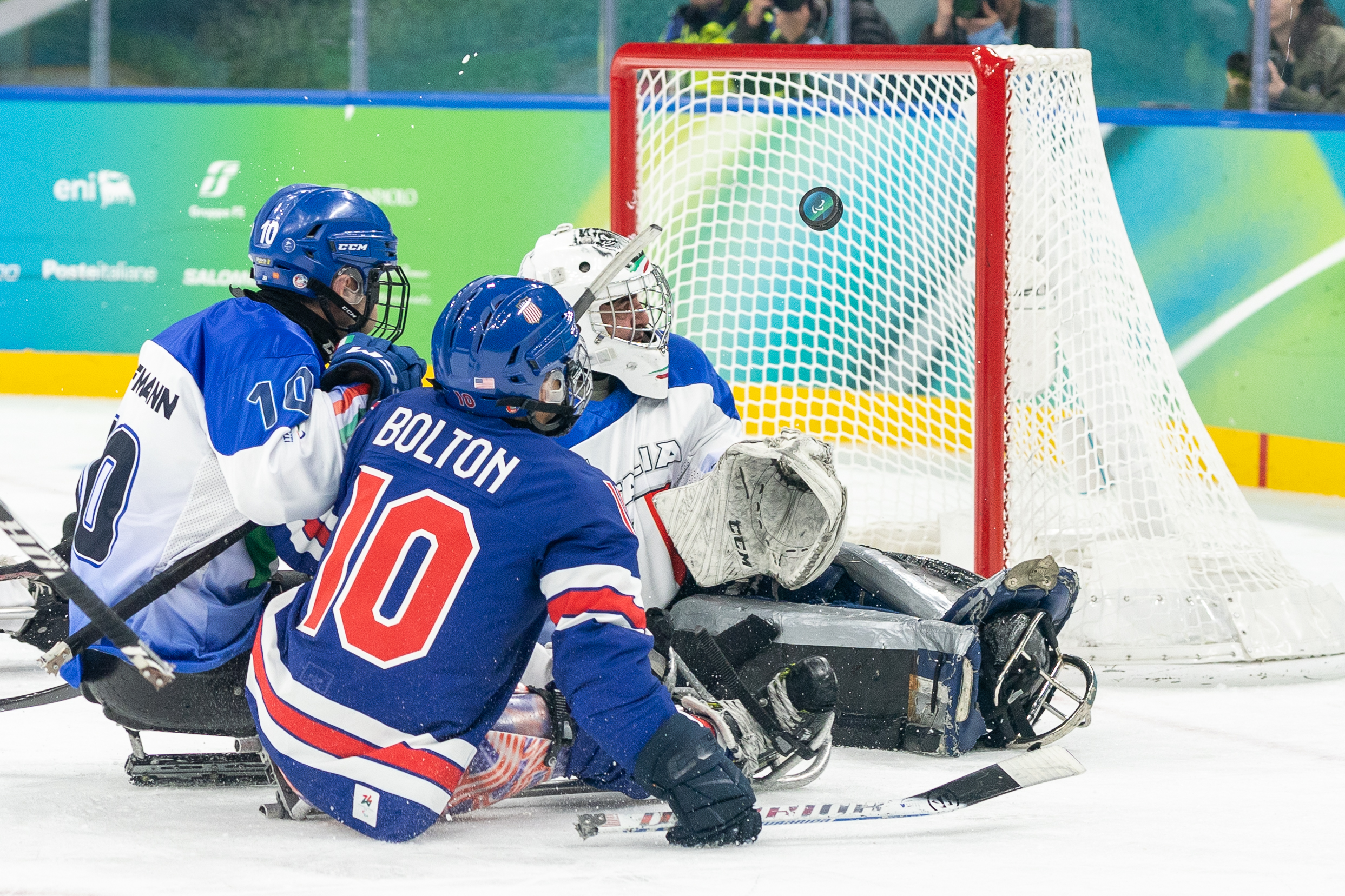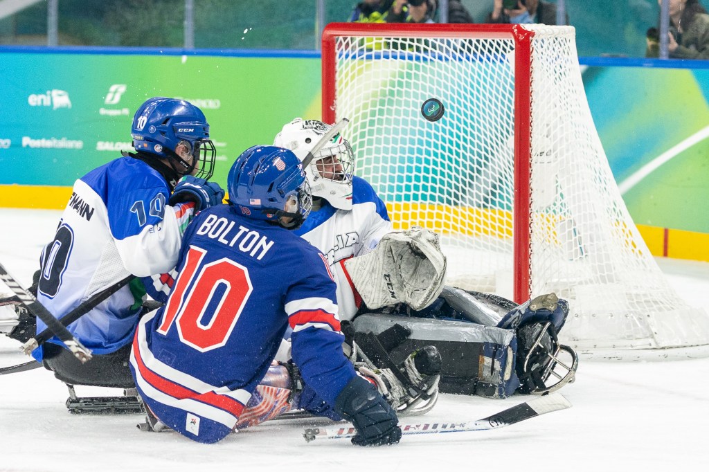 Italy’s goaltenders faced heavy pressure as the Americans controlled puck possession and quickly shut down Italian breakout attempts. By the end of the matchup, Italy had faced 53 shots on goal from the defending Paralympic champions.