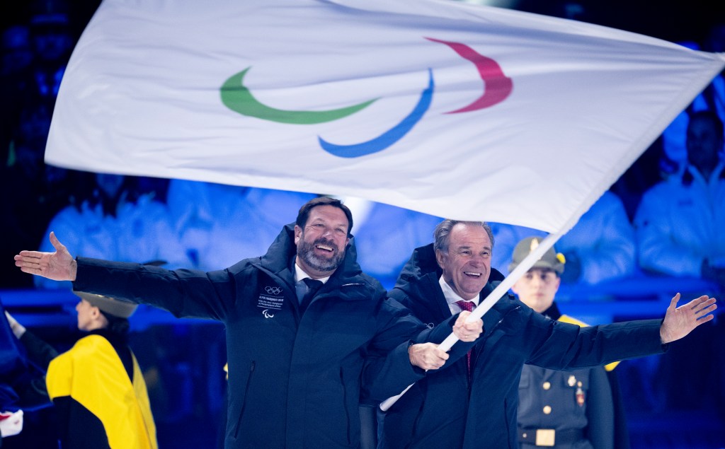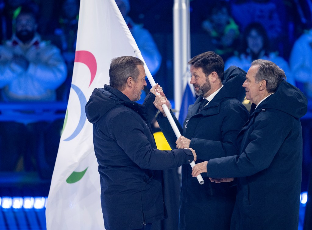 The mayors of Milano and Cortina d’Ampezzo presented the flag to International Paralympic Committee President Andrew Parsons, who then handed it to Renaud Muselier and Fabrice Pannekoucke, the regional leaders representing the French Alps 2030 Paralympic Winter Games.