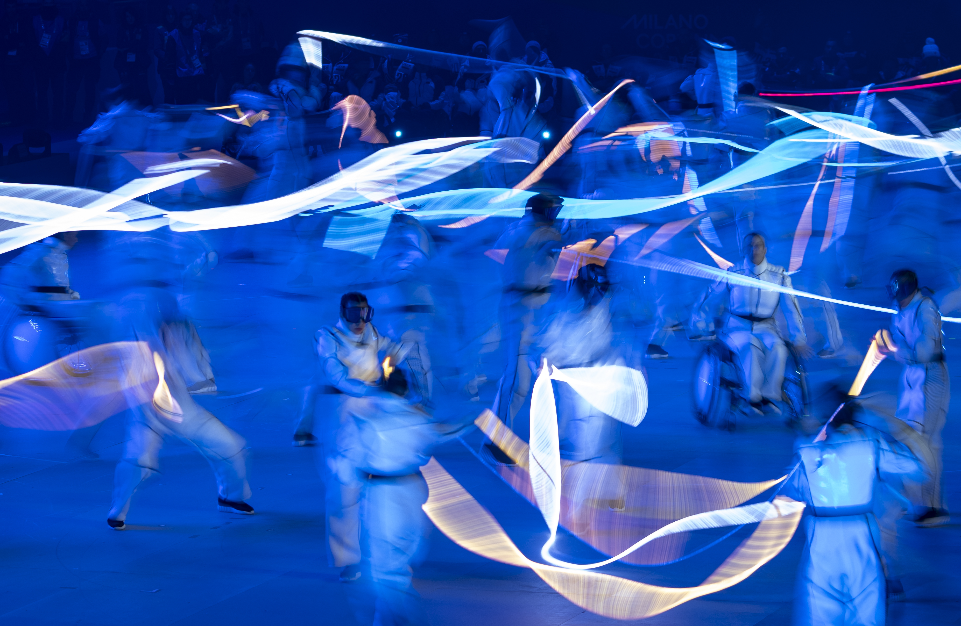 Dancers soon joined the stage, transforming the arena floor into a canvas of movement and light as glowing crutches traced pictograms representing sport and inclusion.