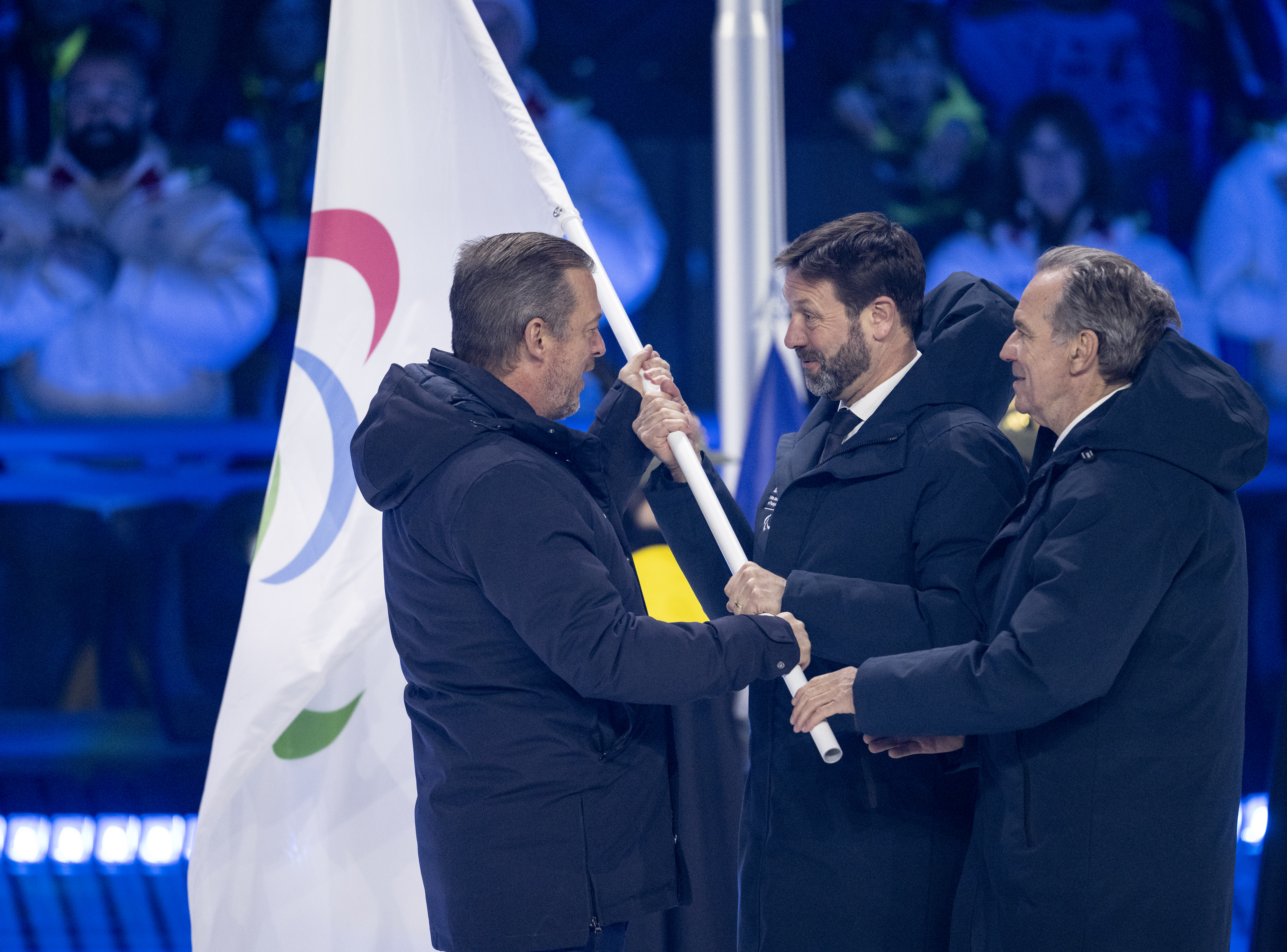 The mayors of Milano and Cortina d’Ampezzo presented the flag to International Paralympic Committee President Andrew Parsons, who then handed it to Renaud Muselier and Fabrice Pannekoucke, the regional leaders representing the French Alps 2030 Paralympic Winter Games.