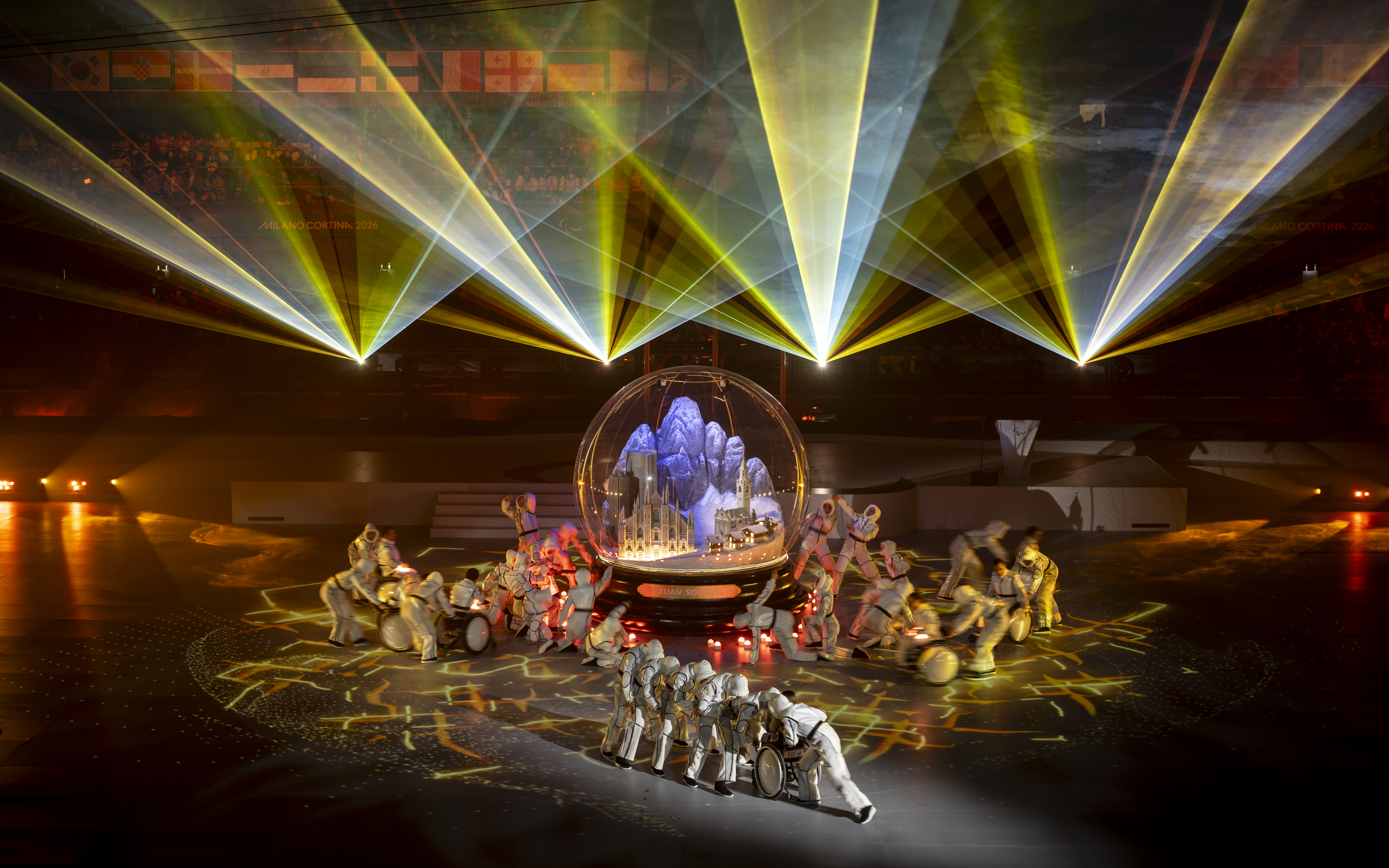 Through fog, projection and light, a large snow globe emerged on the stadium floor, containing a stylized landscape that combined the skyline of Milano with the mountains of Cortina.